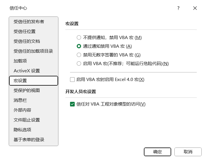 一般是由于您的Excel未信任VBA导致。您可以打开Excel>>文件>>选项>>信任中心>>信任中心设置>>宏设置, 对“宏设置”进行设置选择,并勾选“信任对 VBA 工程对象模型的访问”,确定即可。